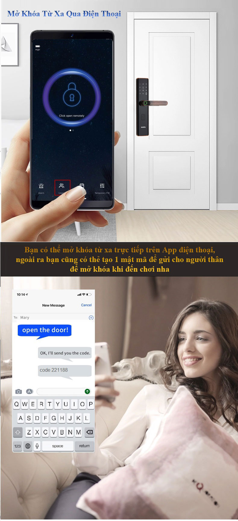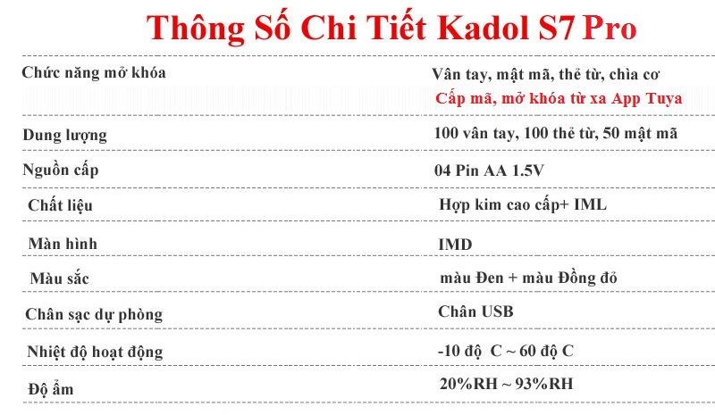 - Mở khóa từ xa qua điện thoại: Kadol S7 có thêm phiên bản có thể mở khóa từ xa qua điện thoại dù bạn ở bất kỳ nơi đâu. Kadol S7 sử dụng app tuya rất phổ thông tại việt Nam. Nó cho phép bạn mở khóa từ xa, cấp mã từ xa