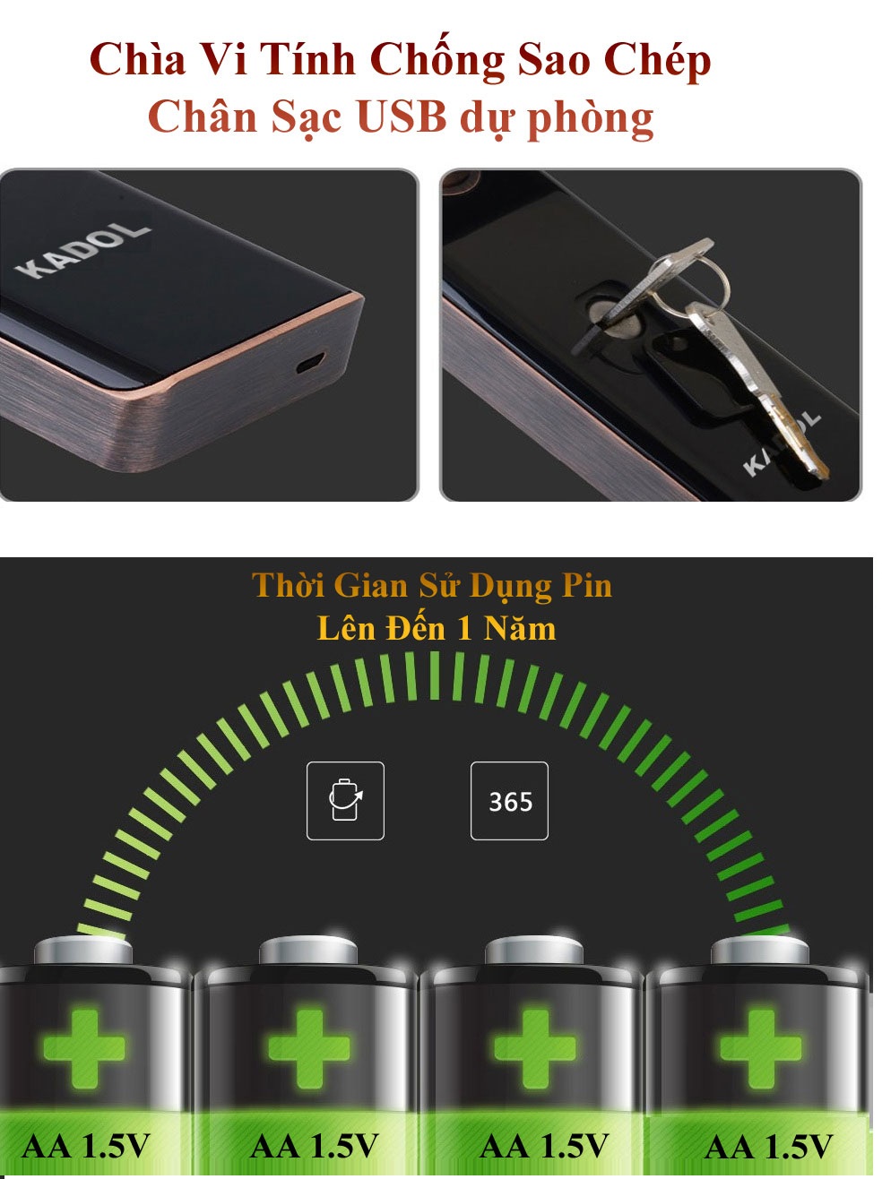 - Chìa cơ: ngoài các chức năng mở khóa bằng công nghệ thông minh kadol S7 còn trang bị chức năng chìa khóa cơ dự phòng khi sự cố khẩn cấp